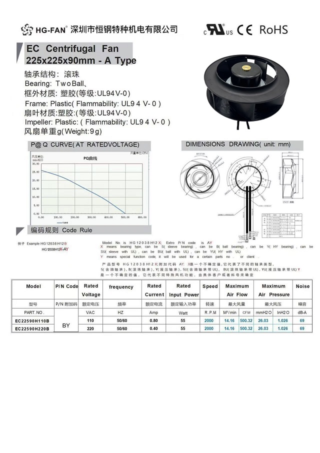 產(chǎn)品名稱:EC交流變頻后傾離心風(fēng)扇225X99MM
